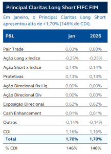 Outro destaque positivo do mês foi nossa posição comprada em Itaú. Ao longo do período, a companhia divulgou a prévia operacional do 4T25, que mostrou queda de 33% nos lançamentos e nas vendas Ainda assim, a sinalização da empresa para o ano permanece positiva, e a ação recuperou as perdas registradas em dezembro.