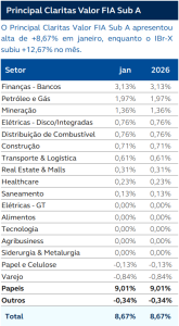 A Petrobras foi o principal destaque positivo do fundo em janeiro, impulsionada pela forte entrada de capital estrangeiro no mercado brasileiro. Além disso, o preço do petróleo bruto avançou 13,57% no mês, refletindo o aumento das tensões geopolíticas entre Irã e Estados Unidos, o que também contribuiu para o desempenho positivo das ações da companhia. No operacional, a companhia entregou produção recorde de 2,99 milhões de boe/d em 2025 (+11% a/a), com avanço relevante no pré-sal, que já representa 82% da produção total.