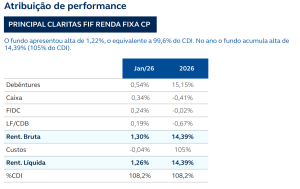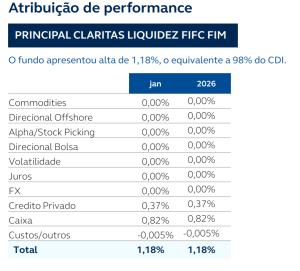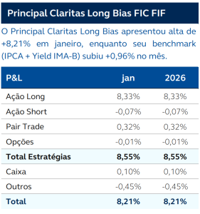 O principal destaque negativo do mês foi nossa posição em Vivara. A empresa indicou um quarto trimestre com margens abaixo do esperado e vendas mais fracas em dezembro, o que aumentou as preocupações em relação ao ritmo de crescimento em 2026. Além disso, a forte alta no preço da prata — uma de suas principais matérias-primas — intensificou as dúvidas sobre a capacidade da companhia de repassar custos sem comprometer sua competitividade, especialmente sob a marca Life. Outro destaque negativo do mês foi nossa posição em Suzano. Apesar do forte rali do mercado em janeiro, a ação não acompanhou o movimento, refletindo seu perfil mais defensivo em um ambiente de maior apetite por risco. Adicionalmente, a valorização do real ao longo do mês pressionou as expectativas de resultados da companhia, considerando que quase 80% da receita é dolarizada, contribuindo para o desempenho negativo no período. A Petrobras foi o principal destaque positivo do fundo em janeiro, impulsionada pela forte entrada de capital estrangeiro no mercado brasileiro. Além disso, o preço do petróleo bruto avançou 13,57% no mês, refletindo o aumento das tensões geopolíticas entre Irã e Estados Unidos, o que também contribuiu para o desempenho positivo das ações da companhia. No operacional, a companhia entregou produção recorde de 2,99 milhões de boe/d em 2025 (+11% a/a), com avanço relevante no pré-sal, que já representa 82% da produção total.
