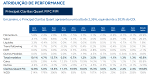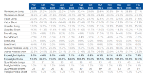 Em janeiro, tivemos um mês de forte alta do Ibovespa, subindo 12,6%. Dentro deste contexto, tivemos um forte desempenho das estratégias de Valor e Tendência, que contribuiram para os resultados do fundo com 1,31% e 0,53%, respectivamente. Por vezes, em movimentos de forte alta dos mercados, temos movimentos negativos em Momentum, mas essa estratégia trouxe apenas uma perda modesta, de 0,09%.