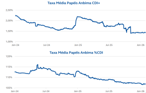 Depois de um mês de forte resgate na indústria em dezembro, os fundos de crédito privado voltaram a apresentar captação positiva em janeiro. Já os spreads das debêntures tradicionais seguem, de forma agregada, em patamar estável. Destaque negativo do mês para Kora Saúde, Tupy e GPA, enquanto positivos foram CSN, Simpar e Dasa.