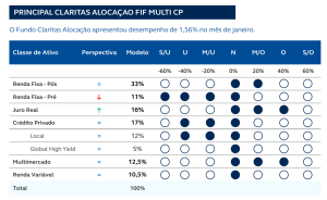 No Brasil, os mercados foram fortemente influenciados por esse contexto externo, contribuindo para uma apreciação relevante da bolsa (alta de 12,56% no mês), além de um fechamento acentuado da curva prefixada e de uma valorização do real frente ao dólar. No âmbito doméstico, o Banco Central manteve a taxa básica de juros em 15%, revisando sua comunicação de política monetária de forma a abrir espaço para um corte na reunião de março. No segmento de juros, o contrato DI Jan/35 (10 anos) apresentou forte abertura de prêmios ao longo do mês, passando de 13,58% para 13,31%, refletindo o movimento de queda generalizada nas taxas longas. Em resposta, mantivemos o book de juros nominais zerado, enquanto preservamos a posição em juros reais (duration) dentro do portfólio. No crédito privado local, a alocação foi mantida estável durante o mês. Observamos um ambiente de mercado mais apertado em termos de spreads negociados, o que nos leva a considerar que outras classes de ativos apresentam oportunidades mais atraentes no ciclo atual.Em multimercados, continuamos a privilegiar a exposição em estratégias macro, que ampliamos ao longo do mês. Diante da maior volatilidade e da abertura de prêmio de risco em diversos mercados, entendemos que essas estratégias estão mais bem posicionadas para captar movimentos irecionalmente relevantes e gerar performance ajustada ao risco. Por fim, na parcela de equities, mantemos uma posição tática net long em bolsa de aproximadamente 12%, estruturada de forma a capturar alpha de maneira resiliente e com proteção relativa — por meio de exposição comprada em veículo de ações e vendida no índice Ibovespa.